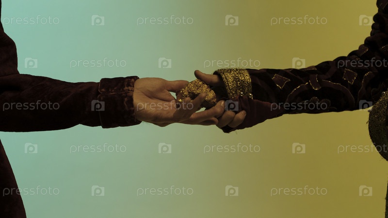 Закройте руку с восточным человеком, отдавая большой золотой кусочек другому человеку, изолированному на зеленом и желтом фоне