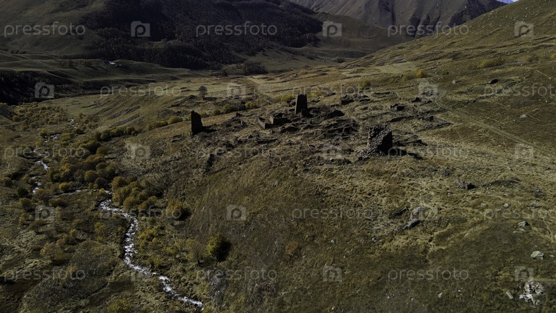 Старое кладбище с руинами древних гробниц, расположенных в горах. Кадр. Вид из воздуха на старинное место захоронения с осколками кирпича на фоне горного склона, покрытого деревьями