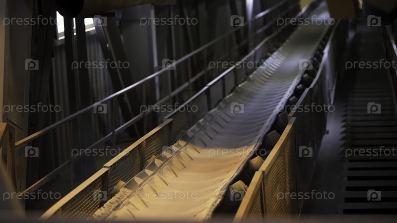 Промышленный фон внутри цеха растений и движущийся конвейер с узкой полосой белой ткани