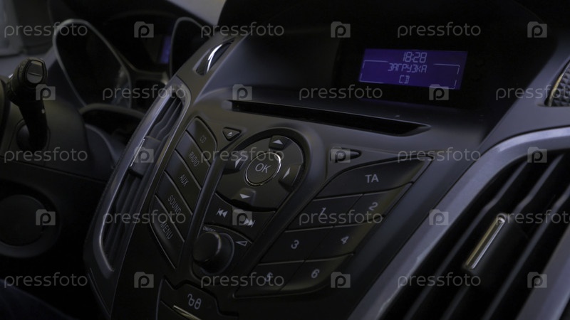 Человеческая рука помещает диск в автоплеер. Кнопка управления для CD-плеера в автомобиле. Рука вставляет диск в радиокар