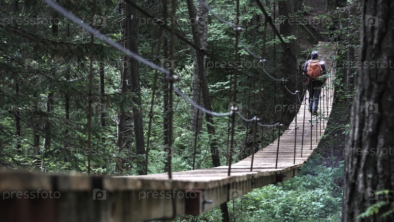 Подвесной мост на пешеходной тропе через густой зеленый лес с человеческим путешественником в красном рюкзаке
