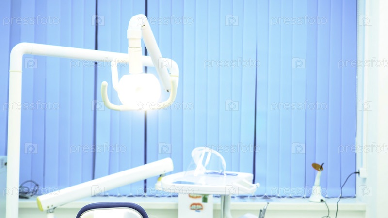 Зубной стул и другие аксессуары, используемые стоматологами в синем цвете, медицинский свет, концепции медицины.Современное зубное оборудование в пустом шкафу