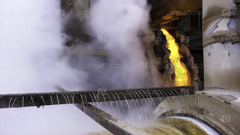 Жидкий металл, протекающий из высокой печи. резервные кадры. Промышленный фон, расплавленный металл или горячая сталь на производственной линии в горячей мастерской завода, профессиональное оборудование