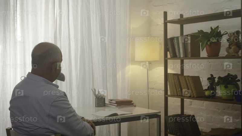 Внимательный старший в гостиной.Трудный старик сидит за столом