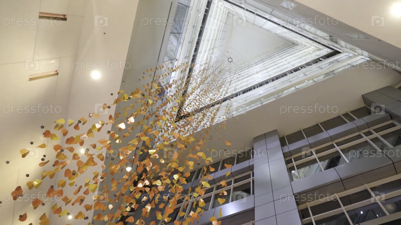 Люстры конфети в современном здании, вид снизу Золотой кристалл, абстрактный фон Блестящий фон из свечей
