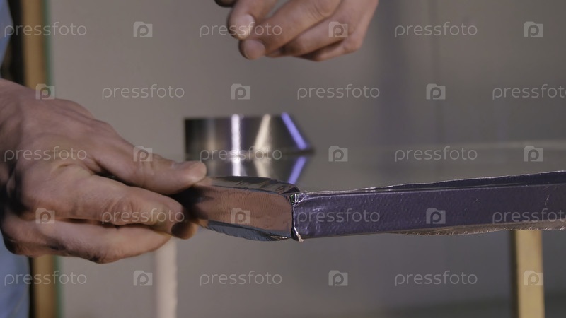 Стекло. Производство стекла для окон в производстве. Стекло, усиленное лентой. После шлифования рабочий с помощью арматурной ленты наклеивает угол стекла. изготовление