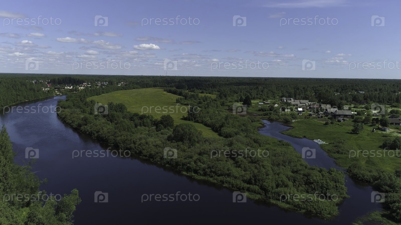 Вид из воздуха на природный пейзаж с рекой, протекающей между небольшим городом или деревней. Летать над зеленым лесом, лугом и рекой на фоне голубого облачного неба
