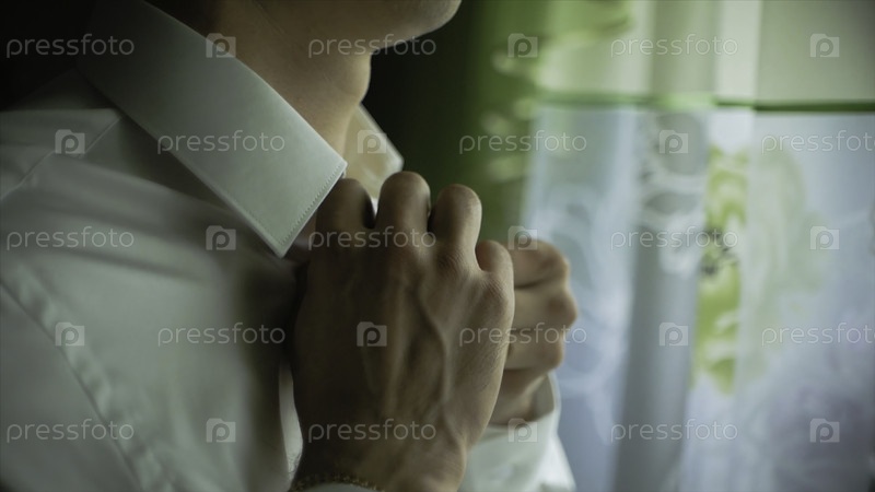 Мужчина застегнул белую рубашку, стоя перед ярким окном.Клип 'Люди, бизнес, мода и концепция одежды - покрытие мужчины путем переодевания и застегивания футболок дома'