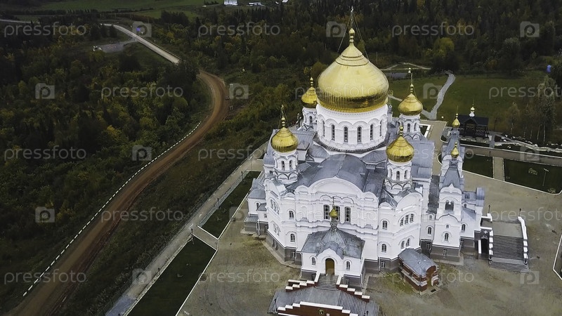 Вид с воздуха большой белой христианской церкви со золотыми куполами на холме и полем с лесным фоном