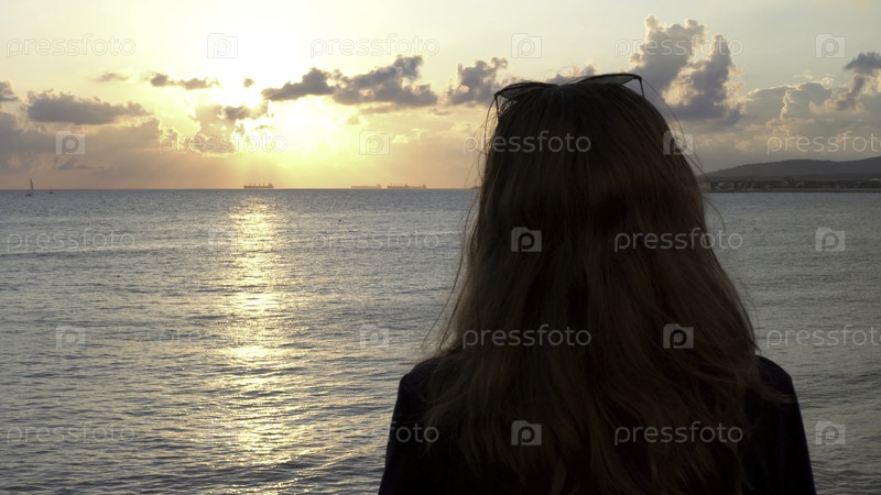 Молодая стройная девушка в черной футболке, стоящая у моря, опираясь на перила во время восхода солнца
