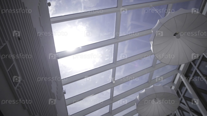 Вид на солнце и голубое небо через окно движения. Светильники. Вид из окна. Вид на небо из окна. Окна крыши. Солнечный свет сквозь крышу. Свет в доме