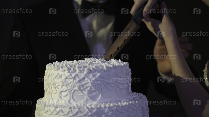 Руки жениха и невесты разрезают кусок свадебного торта