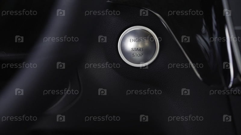 Рука водителя нажимает кнопку запуска двигателя.Сток.Современный роскошный интерьер кроссовера