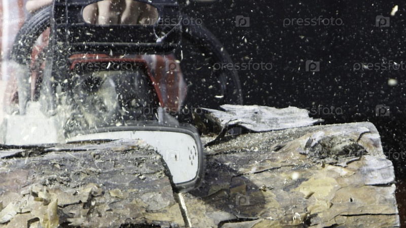 Закройте древесину с помощью бензопилы. видео. плотник-мужчина перерезал часть ствола дерева, а деревянные лопатки летели по бокам