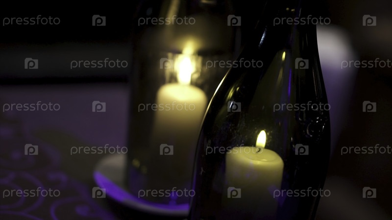 Декоративные бутылки с свечами внутри. Красивые стильные свечи в бутылках. В бутылках есть свеча. Летнее домашнее украшение, стеклянная банка и бутылка, светодиодный светильник внутри