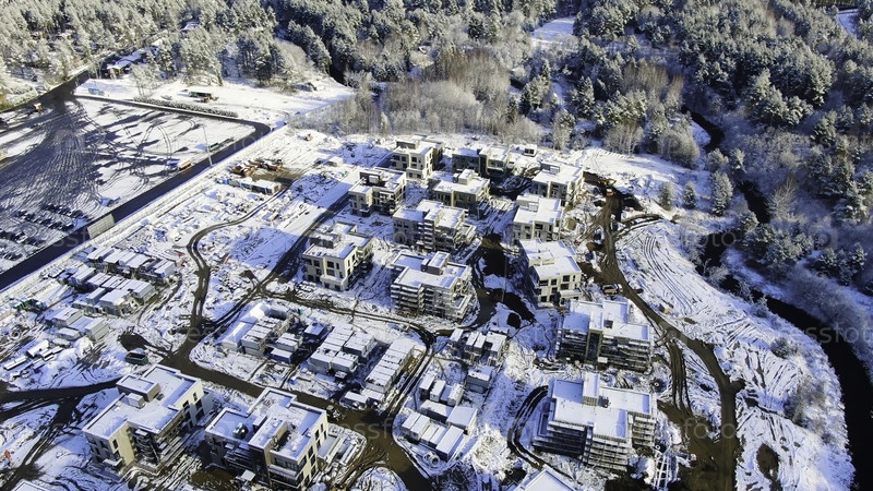 Вид на загородные дома зимой.Движение.Воздушный вид леса и отдельных домов зимой