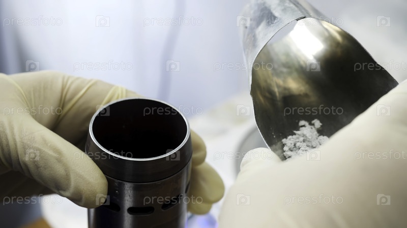 Закройте руки в медицинских перчатках, поместив химический порошок из химической ложки в небольшую металлическую емкость в лаборатории