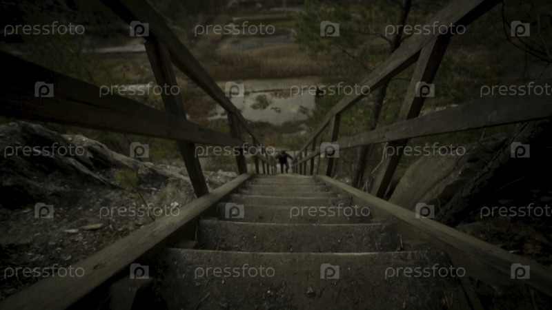 Мужчина поднимается по лестнице. Видеозапись. Старые деревянные ступени на холме, возвышающиеся с обеих сторон травы. Деревянная лестница вверх по травянистому холма