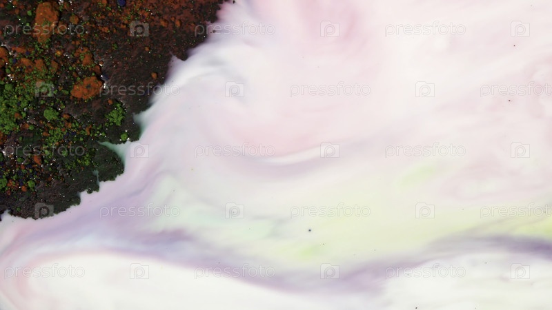 Вид сверху сухого зеленого, желтого и красного чернил, плавающих в белом молочном веществе. СМИ. Красивый радужный фон с разноцветными красками, смешанными с белой жидкостью