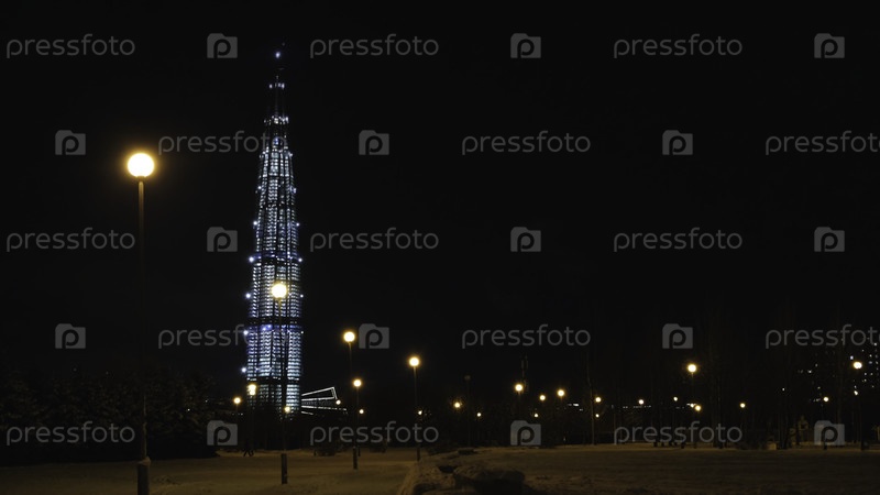 Вид снизу на красивый небоскреб Lakhta Centre ночью, спроектированный награжденным британским архитектором Тони Кеттлом.Концепция.Самая высокая башня в Европе