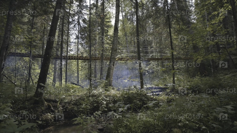 Вид курящего человека с рюкзаком, идущего по деревянному подвесному мосту в хвойном лесу