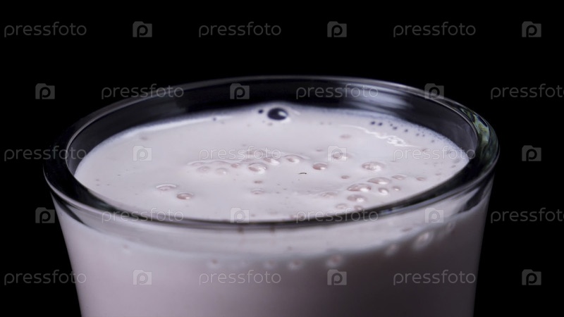 Стекло со клубниковым молочным коктейлем. Рамка. Свежевыбитый розовый молочный коктейль в прозрачном стекле на черном изолированном фоне
