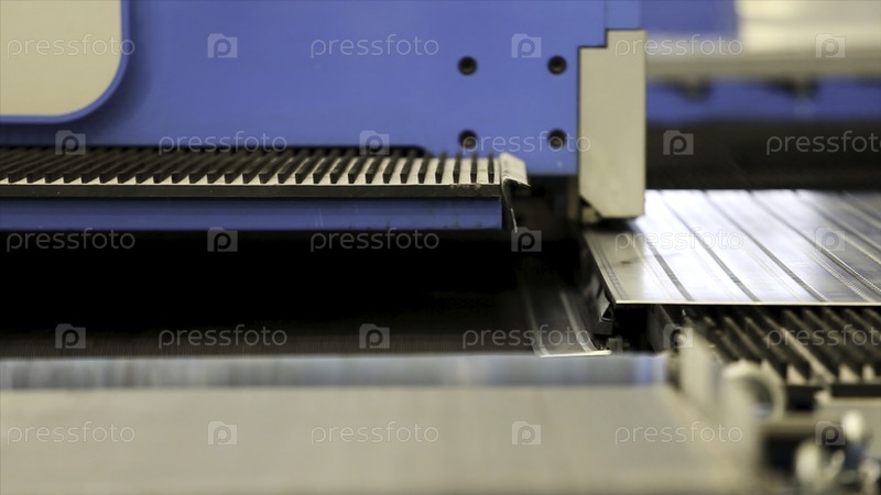 Резка отверстий перфорация штамповки металлических листов на промышленной CNC-машине. Близкий план координат CNC, проникающих в пресс, перфорирует металлолист. Автоматизация работы. Оборудование для охлаждения и вентиляции