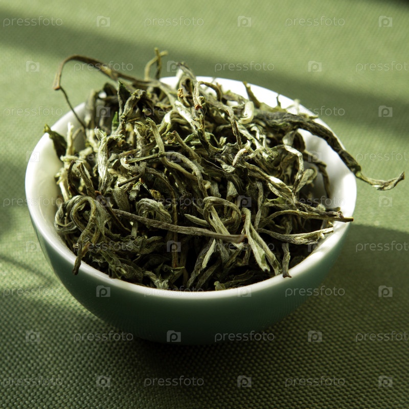 Близкий план ярких, высушенных зеленых листьев чая в миске, демонстрирующий их красоту и уникальную текстуру