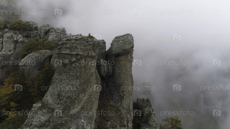 Вид вблизи скальной колонны.Стрельба.Вид сверху на каменную скальную колонну, к которой приближается густой туман.Осенний пейзаж с красочными кустарниками и плотным серым туманом на горе