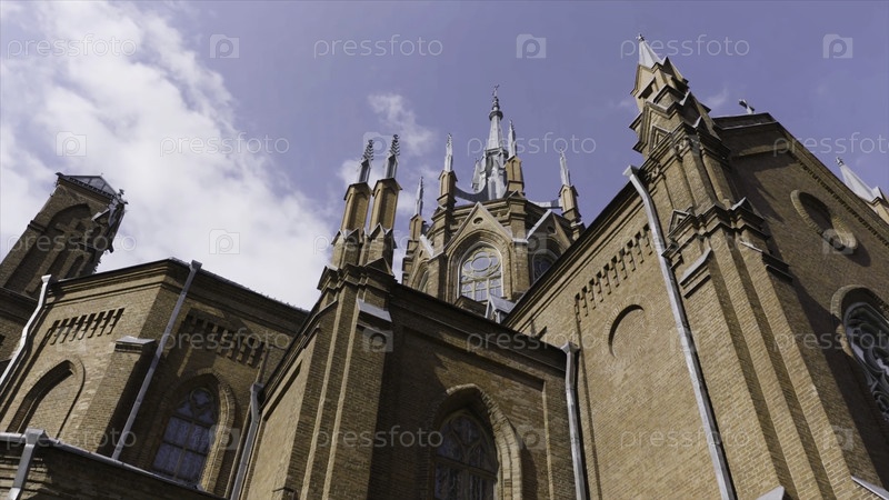Прекрасный вид на древний собор на фоне голубого облачного неба.Продолжайте.Старая историческая достопримечательность из кирпичей, концепция архитектуры