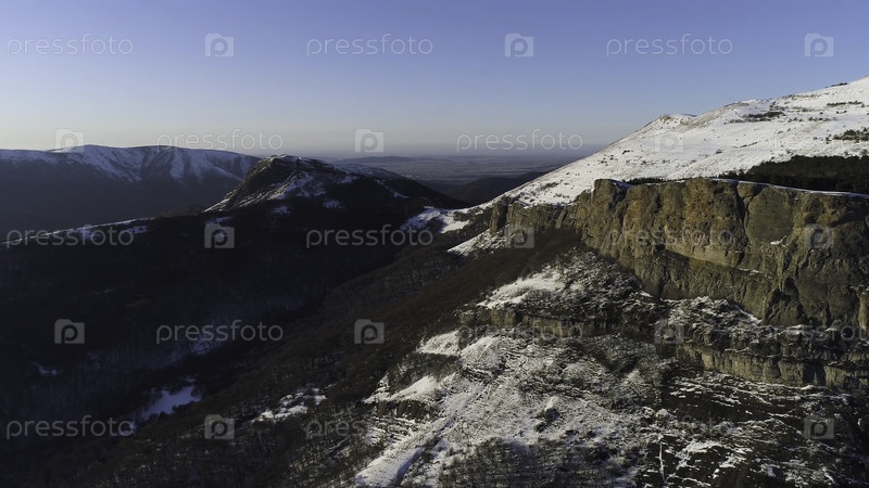 Вид с воздуха на горы в солнечный осенний день на фоне чистого синего неба. летая над заснеженными крутыми скалистыми стенами, где растут лысые деревья