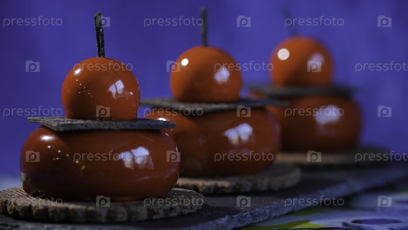 Три красных торта с печеньем и шоколадом.Красные торты на темно-синем фоне