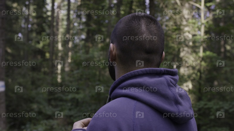 Вид на человека, стоящего с наушниками и слушающего музыку в лесу. старший бегун с наушниками делает растяжку. осенняя природа