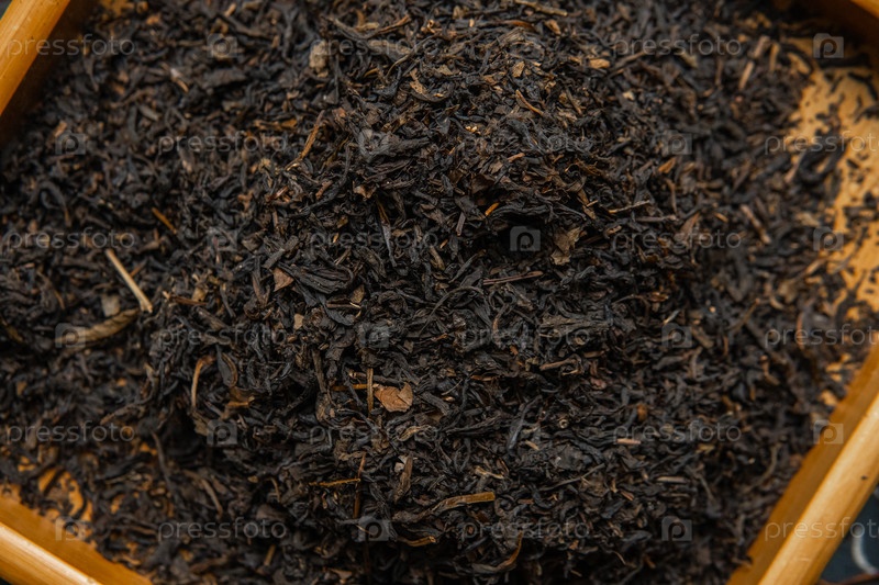 Сушеные листья черного чая, тщательно сортированные и аккуратно помещенные в красивую деревянную миску