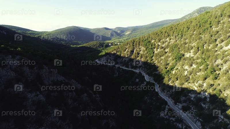 Вид с воздуха на дорогу между высокими горами, покрытыми зелеными деревьями и кустарниками, синее небо в солнечный летний день. Съемки. Красивый красочный пейзаж