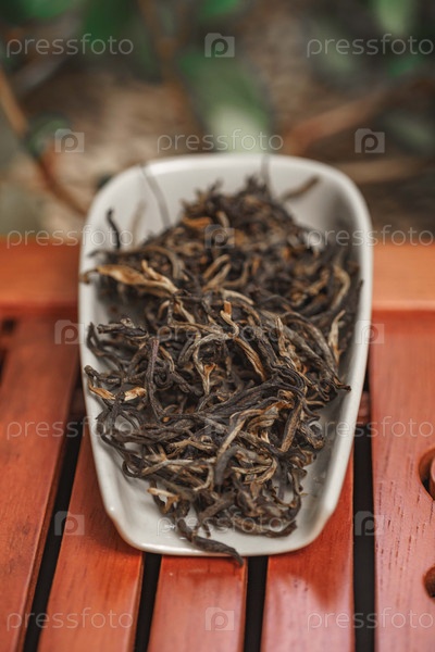 Красиво устроенные сушеные чайные листья в декоративной тарелке для элегантной презентации