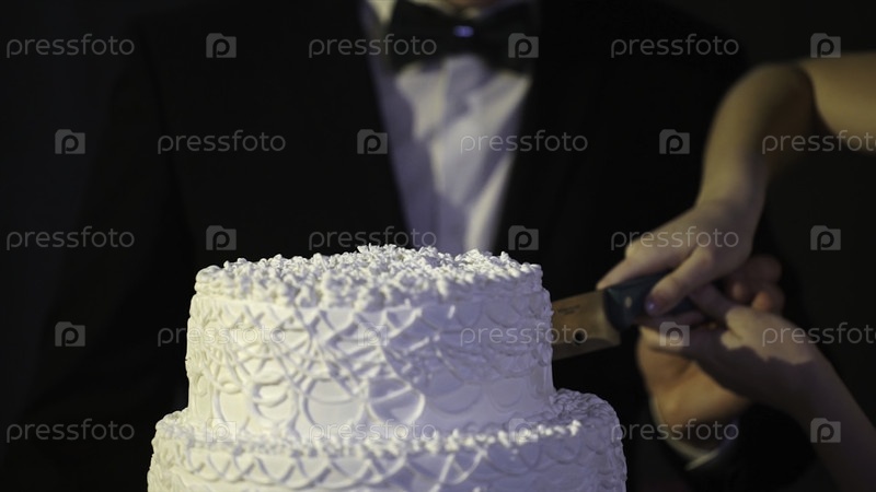Руки жениха и невесты разрезают кусок свадебного торта