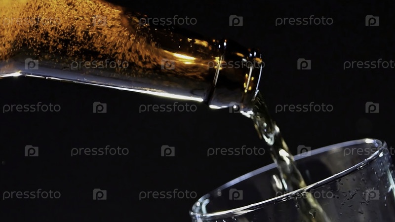 Закройте налив пива из стеклянной коричневой бутылки в стакан.Видео.Пейте алкогольный напиток, выделенный на черном фоне, концепция вечеринки