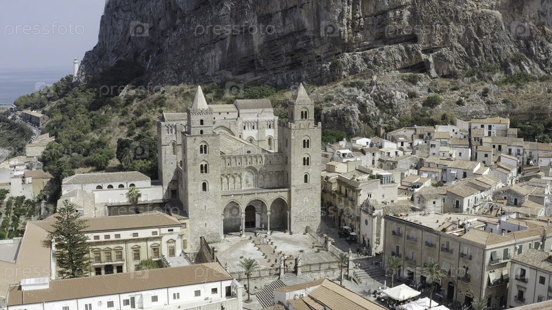 Потрясающий вид на старый серый собор, окруженный зданиями с большой горной скалой на заднем плане в теплый летний день