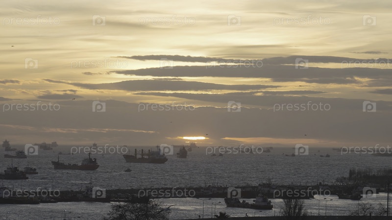 Морская гавань для грузовых судов на фоне захода солнца. идите вперед. многие различные суда плывут в море у побережья при закате солнца. морская гавань с чайками на фоне заходящего горизонта