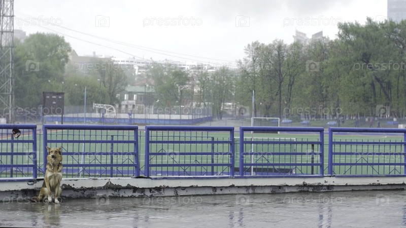 Одинокая собака ждет своего хозяина. красивая коричневая собака, прикованная в цепи снаружи во дворе. пес ждёт владельца на улице