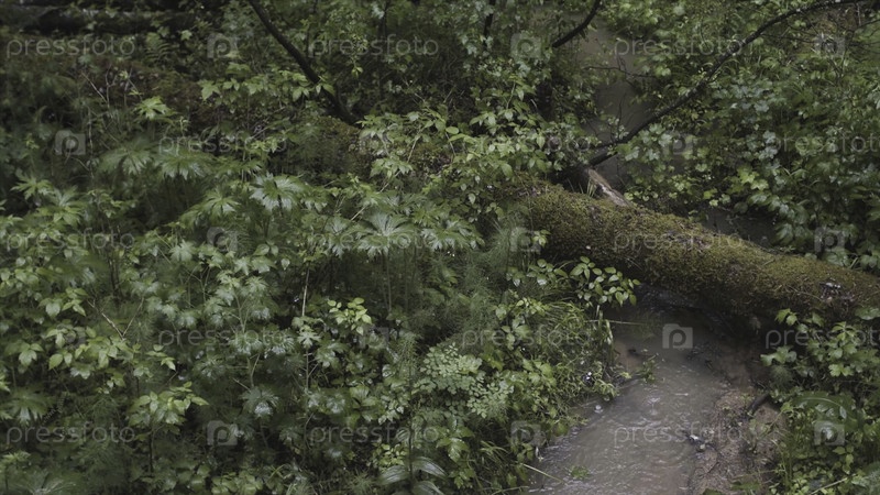 Вид сверху живописного ручья в красивом лесу, где падают капли дождя, летняя природа
