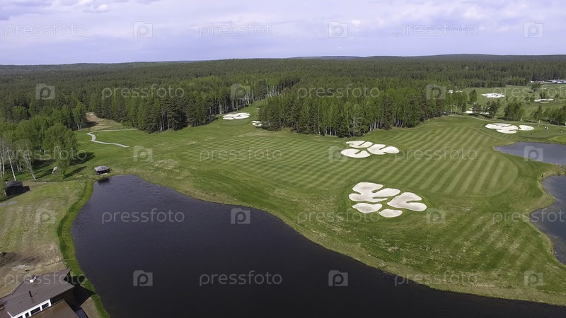 Поле для гольфа в солнечный день, отличный Гольф-клуб с прудами и зеленой травой, вид на небо