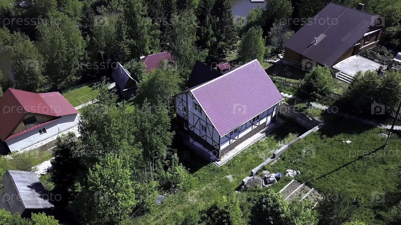 Воздушная деревня с видом на лес летом при хорошей погоде. Клип. Вид на деревню в лесу летом