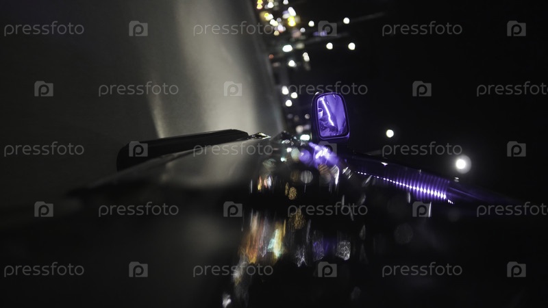 Ночной город сзади машины. кадры. зеркало заднего вида в городе ночью