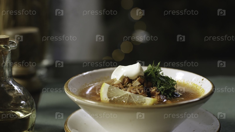 Ручное оформление поставить на стол тарелку с традиционным российским натрием. резервные кадры. русский солевой суп с мясом, колбасами и оливками