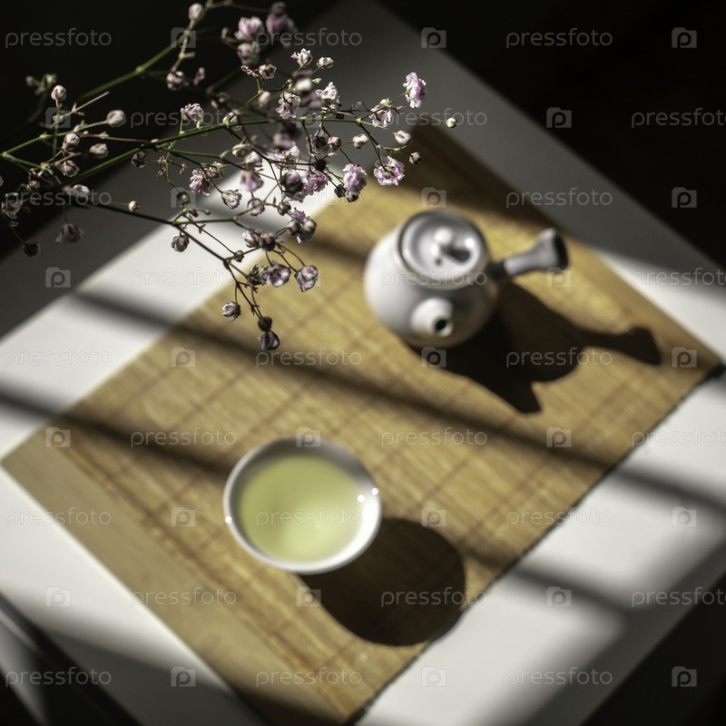 Спокойное расположение чая, свежих цветов и нежных теней идеально подходит для расслабления и осознанности