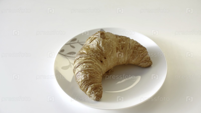 Домашний кроассан на тарелке. Резервные кадры. Вкусный кроассан на тарелке в кондитерском магазине. Выпечка кроассантов на домашней кухне. Концепция завтрака