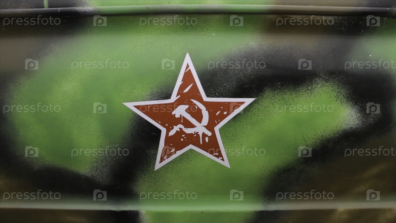 Советская звезда на фоне военной краски.Стрельба.Закрытие старой советской машины