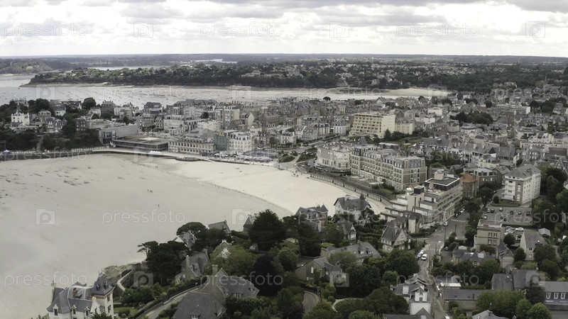 Вид с воздуха на красивые исторические и современные здания у берега реки в европейском городе против серого облачного неба